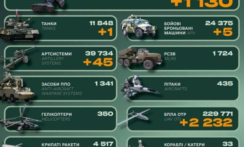 Окупаційна російська армія за минулу добу втратила 1130 одиниць особового складу та один танк.