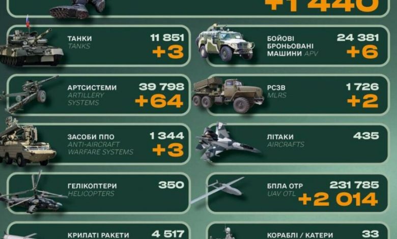 Окупаційна російська армія за минулу добу втратила 1440 одиниць особового складу та три танки.