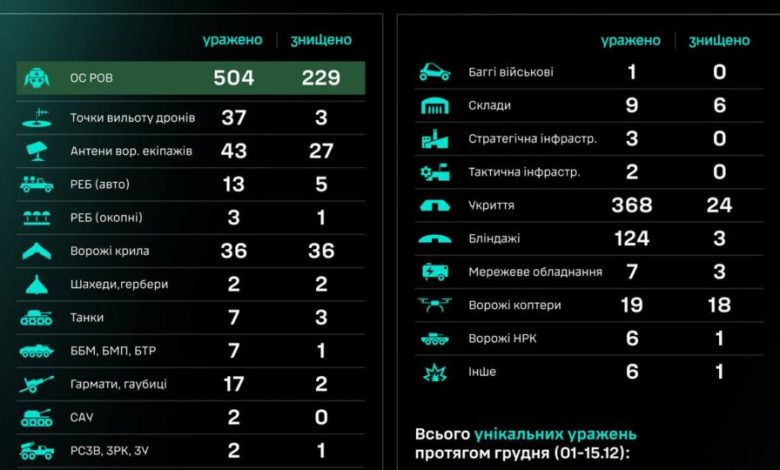 За добу 15 грудня було уражено 504 російських солдати, з яких 229 знищено, а 276 поранено.
