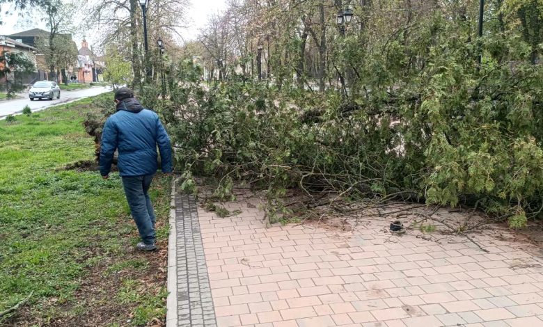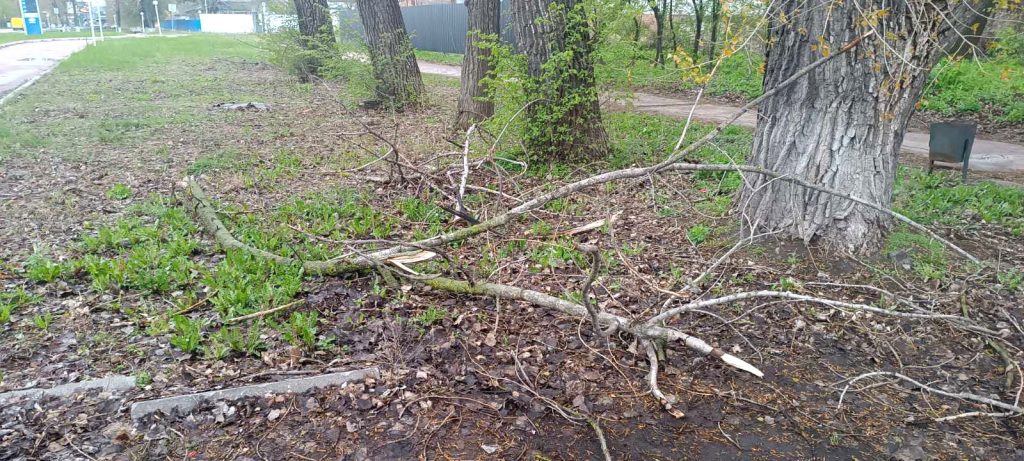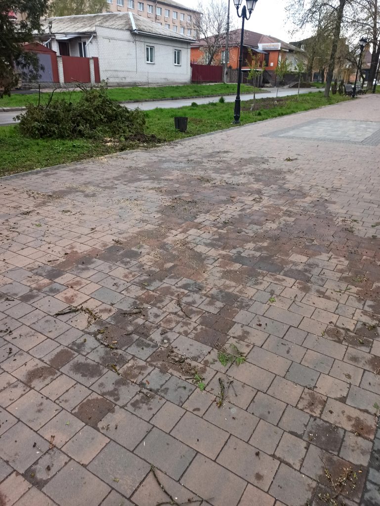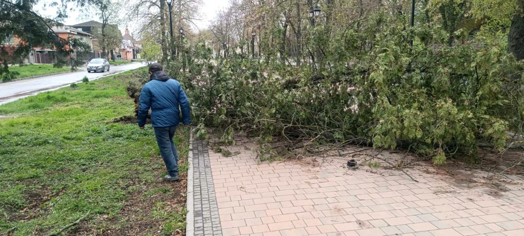 Негода не оминула й Ніжин. Шквальний вітер залишив по собі повалені дерева та гілля у різних районах міста. Працівники КП «ВУКГ» працюють на місцях, розчищаючи вулиці та тротуари, щоб відновити безпечний рух для пішоходів.