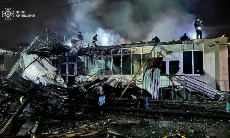 Внаслідок нічної ворожої атаки на Київщину уламки збитого БПЛА впали на двоповерхову будівлю мінімаркету у Броварах, спричинивши пожежу та часткове руйнування споруди.