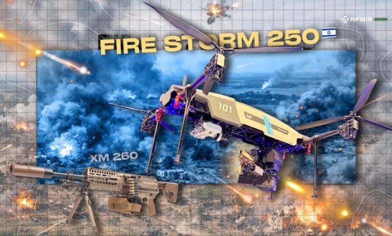 Компанія Israel Aerospace Industries представила Fire Storm 250 — чотиримоторний безпілотник, озброєний роботизованим кулеметом.