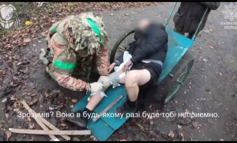Бійці бригади «Хижак» надають першу допомогу цивільному, за яким полював російський дрон. Скрін з відео Нацполіції