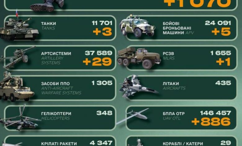 За минулу добу бойові втрати країни-агресора становили 1070 одиниць особового складу.