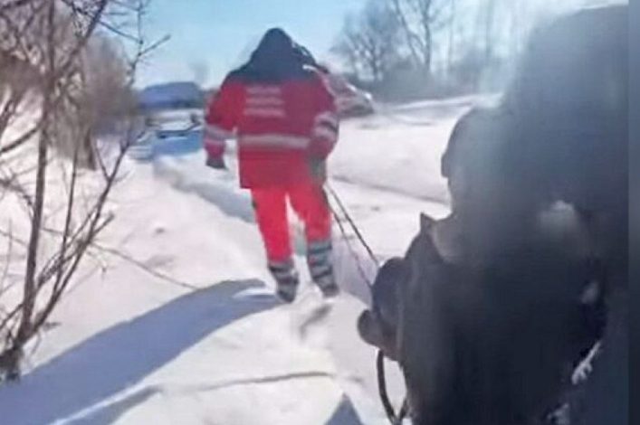На Чернігівщині через сніг і перемети автомобіль екстреної медичної допомоги не зміг під’їхати безпосередньо до будинку пацієнта. Тому медикам довелося екстрено доставляти його на санчатах до автомобіля «швидкої».