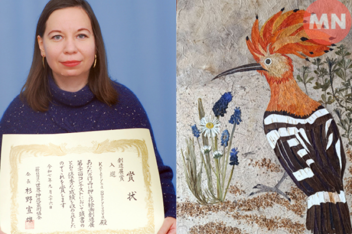Катерина Борисова займається японським мистецтвом «ошібана» – пресована флористика. Цього року її робота «Пташка одуд» була відзначена вибагливим журі на 21 конкурсі пресованої флористики у місті Йокогама.