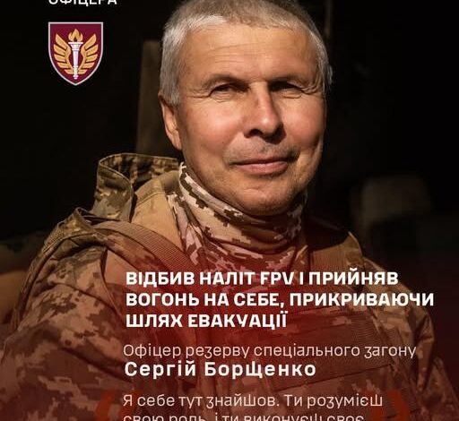 Офіцер резерву спеціального загону Десантно-штурмових військ ЗСУ Сергій Борщенко під час виконання бойового завдання взяв вогонь на себе, прикривши евакуаційну групу. Під час бою дістав важке поранення щелепи, але вижив — і після тривалого лікування знову повернувся у стрій.