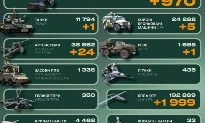 За минулу добу армія країни-агресора втратила 970 одиниць особового складу, а також 5 бойових броньованих машин.