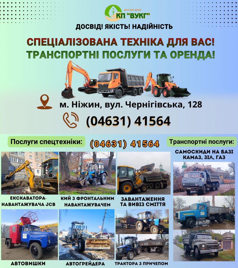 КП «ВУКГ» має багаторічний досвід роботи та пропонує надійний автопарк, до якого входять: автогрейдер, автовишки (ліктьові та телескопічні), вантажні автомобілі, трактори, екскаватор JCB та інша техніка.