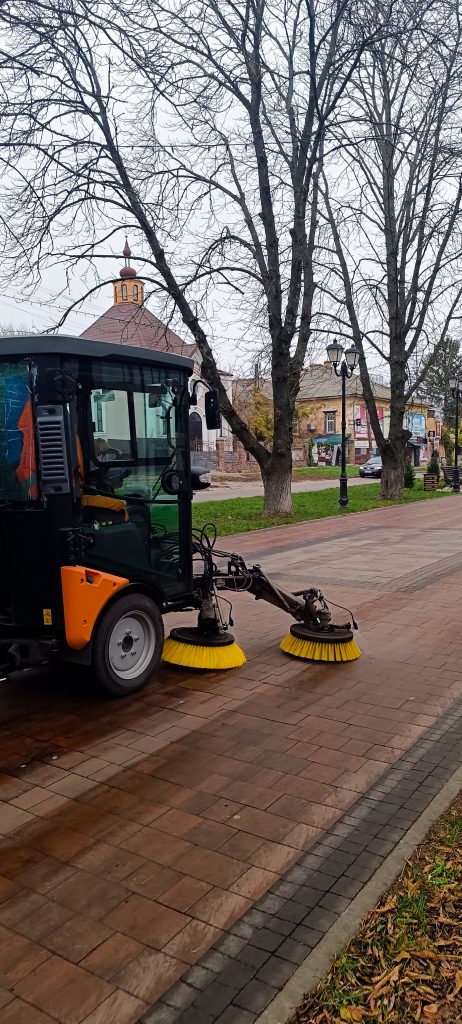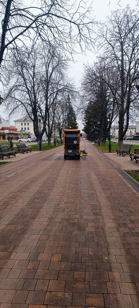 Працівники КП «ВУКГ» щоранку виходять на вулиці, аби подарувати місту чистоту й порядок. Підмітально-прибиральна машина KARCHER MIC 35 швидко змітає опале листя, залишаючи після себе чисті та доглянуті тротуари.
