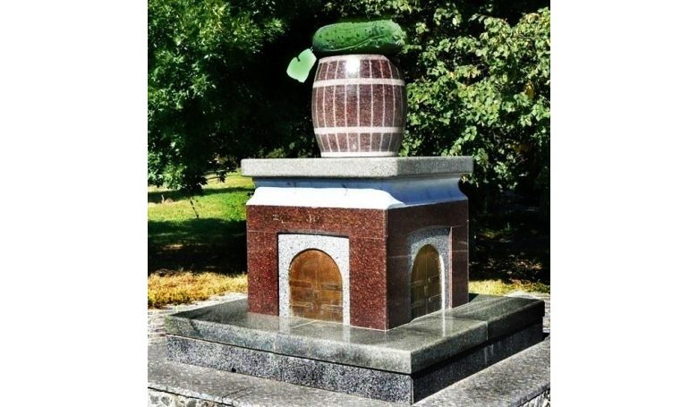 Автор проєкту, де поєдналися погрібець і діжка з огірком, – місцевий митець Леонід Воробйов. Огірок зроблений з граніту унікального зеленого кольору, який привезли з Італії.