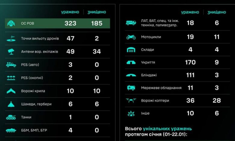 Загалом упродовж січня (01–22.01) знищено/уражено 20620 цілей, з них — 6785 особовий склад противника.
