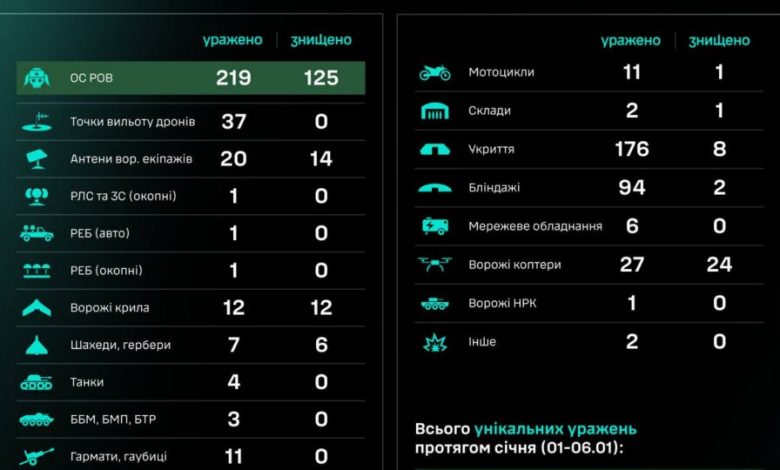Загалом упродовж січня (01–06.01) знищено/уражено 4719 цілей, зокрема 1547 — особовий склад противника.