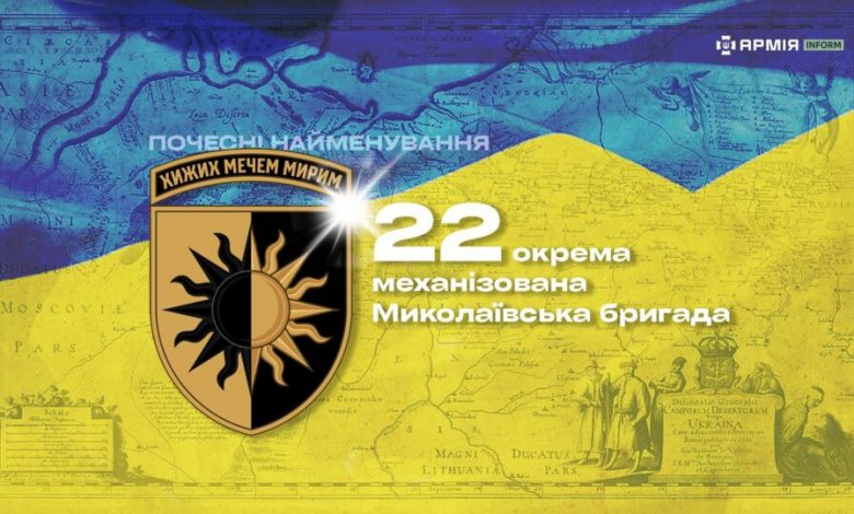 5 травня 2025 року Президент України присвоїв 22 окремій механізованій бригаді Сухопутних військ Збройних Сил України почесне найменування «Миколаївська».