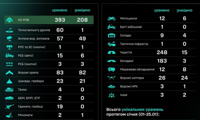 Загалом упродовж січня, за період з 1 по 25 число, підрозділами Сил безпілотних систем уражено та знищено 23 783 цілі противника, з яких 7 756 — особовий склад російських окупаційних військ.