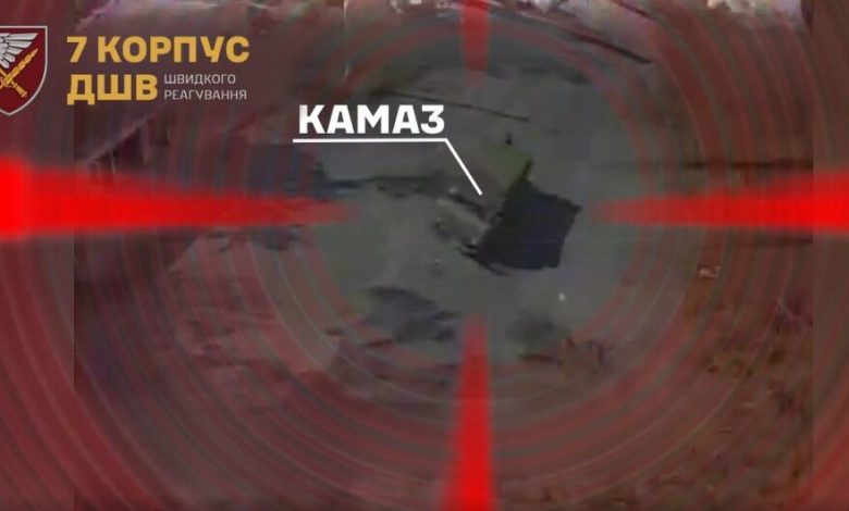 На опублікованому відео можна побачити момент знищення ворожого КАМАЗУ дронарями корпусу ШР ДШВ в районі Курахівського водосховища.
