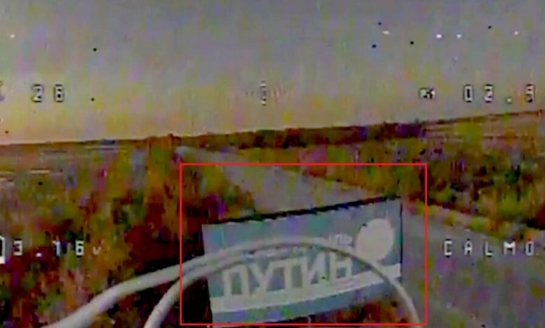 «Саме під цим рекламним банером пілоти FPV полку Калиновського знищили ворожий екіпаж, що рухався на всюдиході», — йдеться в коментарі до відео.