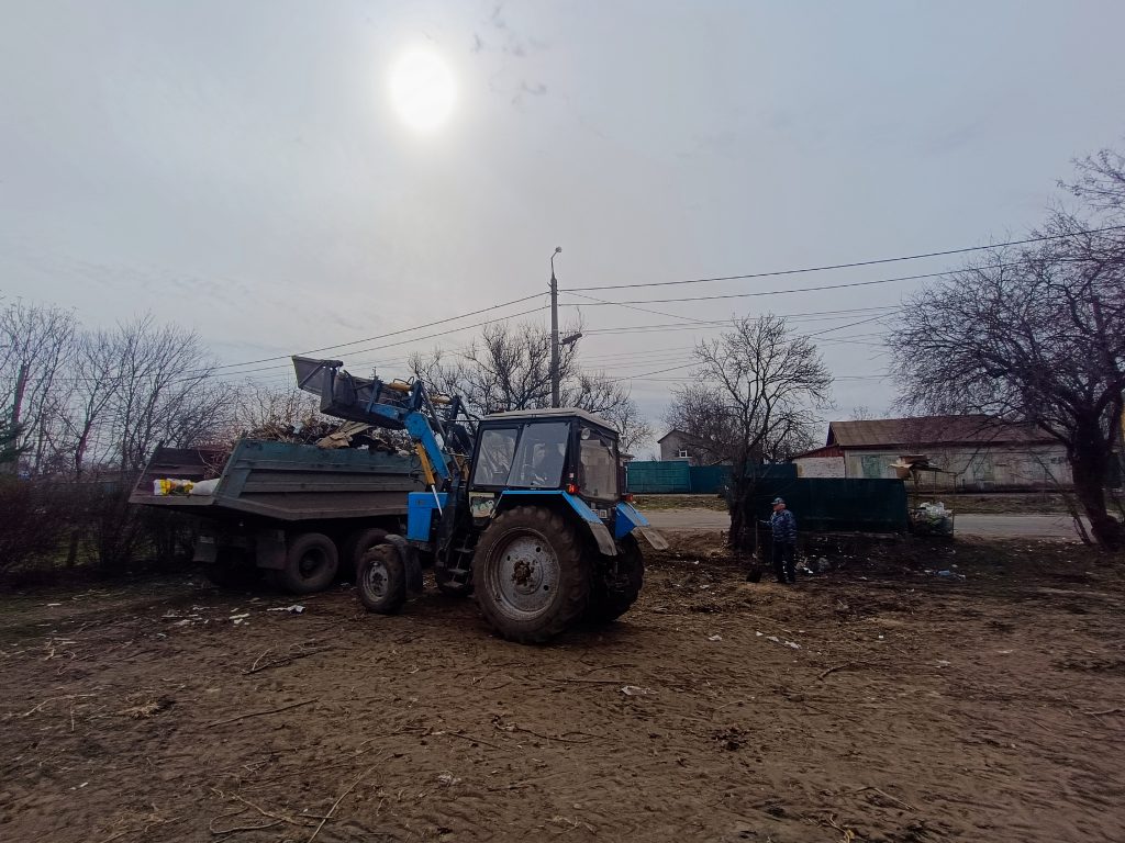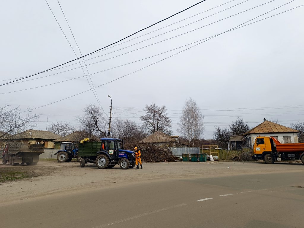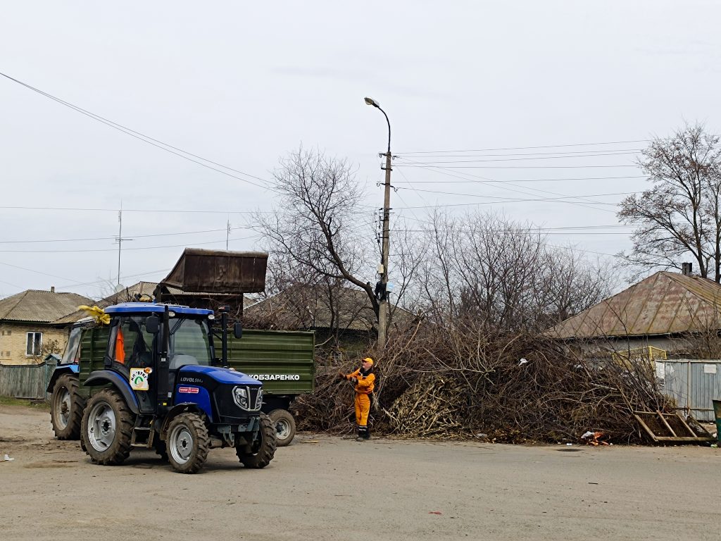 На вулиці Овдіївській чути гул техніки, навантажувач ліквідовує нагромадження гілля довкола контейнерів.
