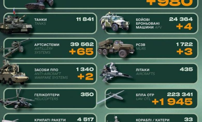 Окупаційна російська армія за минулу добу втратила 980 одиниць особового складу та 5 бойових броньованих машин.