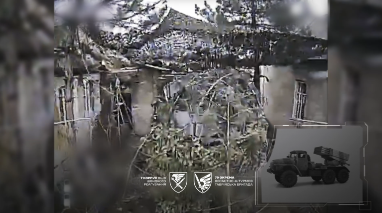 Оператори ударних дронів 79-ї окремої десантно-штурмової Таврійської бригади 7-го корпусу ШР ДШВ знищили реактивну систему залпового вогню БМ-21 «Град».