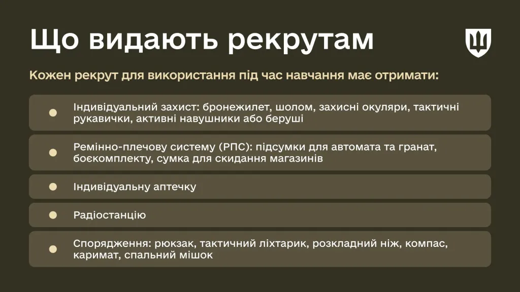 Таке питання безумовно турбує кожного рекрута. Варто врахувати власні особливі потреби (наприклад, ліки), підготувати гігієнічні набори. Але більшість речей, що необхідні під час навчання, забезпечуються державою: