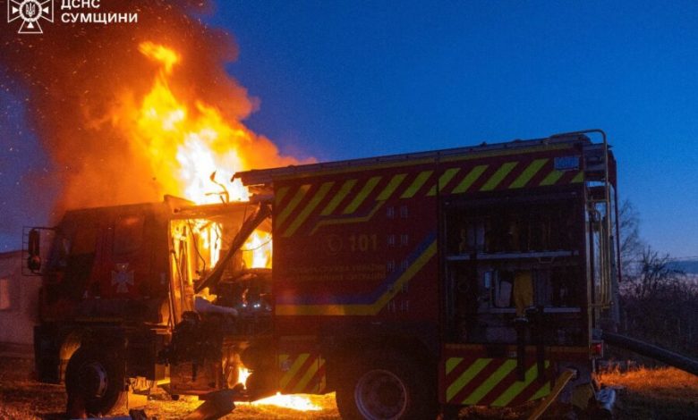 У Сумах російські війська здійснили цинічну атаку на рятувальників, які ліквідовували наслідки попереднього обстрілу. Ворог прицільно вдарив безпілотником по пожежному автомобілю, повністю знищивши техніку. На щастя, особовий склад встиг перейти в укриття.