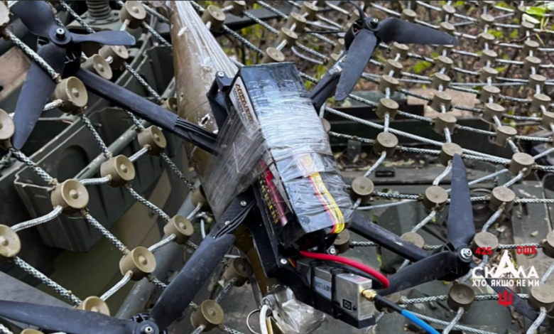 Ворожий FPV-дрон у сітці, натягнутій над Bradley.