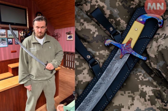 Подарунок спортсмену вручили як знак подяки за його постійну підтримку українських військових. Особливість шаблі в тому, що її клинок містить уламок російської ракети, а руків’я виготовлене з частини рами ворожого FPV-дрона.