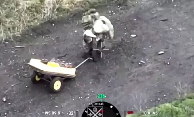 Як видно на оприлюдненому у соцмережах відео, загарбник займався у місті мародерство, тягаючи за собою візочок з награбованим продовольством.