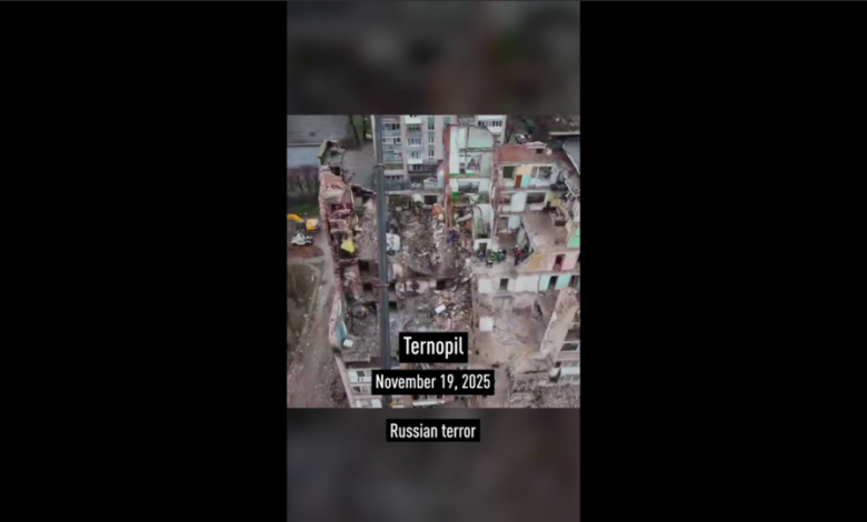 Наслідки російського удару по житловому будинку у Тернополі. Скрін з відео з каналу Президента