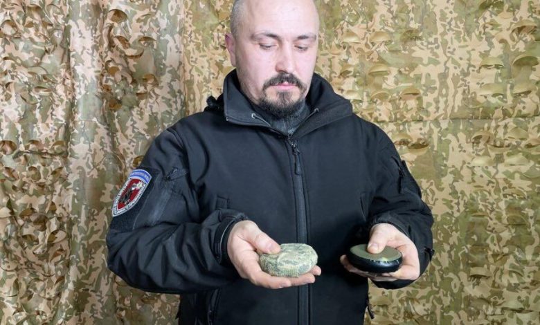 Начальник відділу вибухотехнічної служби Головного управління Національної поліції в Херсонській області Володимир Перепелиця з новою міною, яку розкидають окупанти. Фото зі сторінки 30-го корпусу