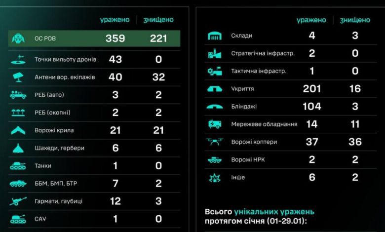 Загалом упродовж січня (з 1 по 29 січня) підрозділи Сил безпілотних систем знищили та уразили 27 205 цілей, з яких 8815 — особовий склад противника.