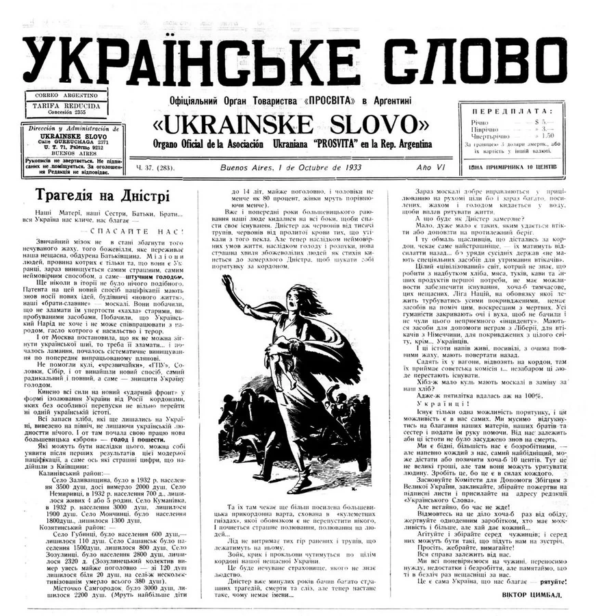 1 жовтня 1933 року Цимбал написав статтю «Трагедія на Дністрі» в газеті «Українське слово» — офіційному органі Товариства «Просвіта» в Аргентині, де він описав те, що українців знищують жахливим способом. Що оскільки «черезвичайки», Соловки, Сибіри не допомогли, то тепер українців просто вбивають голодом. Він писав, що потрібно самоорганізовуватись, бо тих втікачів, які перепливли Дністер — вижили у хвилях і не були вбиті радянськими прикордонниками, можуть видати назад в срср, тому що не вистачає грошей на їх утримання. Він закликав збирати кошти, щоб допомагати таким людям.