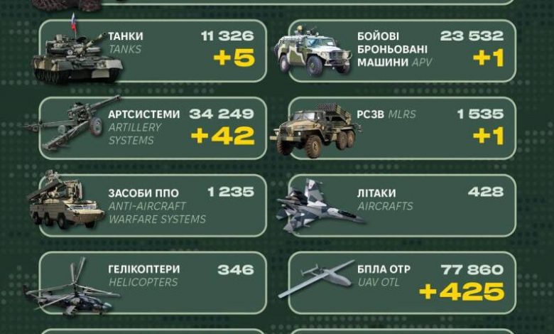 Ворожі втрати за добу становлять 840 військових, п’ять танків та 42 артсистеми