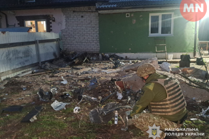 Під час чергової атаки безпілотниками на Чернігів поліції надійшла інформація про падіння на територію приватного подвір’я російського реактивного дрона. 50-кілограмова бойова частина не здетонувала та становила загрозу для людей.