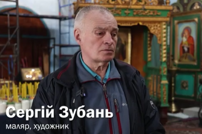 «Почалось усе з того, що он під вікнами штукатурка отак висіла, і священник боявся, щоб вона нікому не впала на голову, отакі були шматки великі. Страшно було. Тому й вирішили ремонт зробити: зашпаклювати і пофарбувати. А потім риштування такі зробили», — Сергій Зубань, маляр, художник.