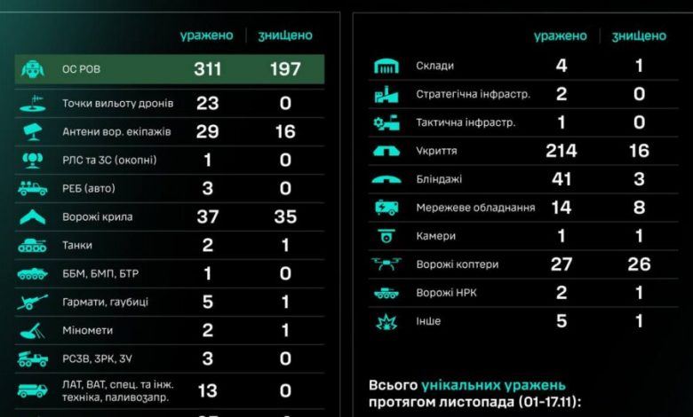 Упродовж листопада (01–17.11) знищено/уражено 14240 цілей, з них 4941 — особовий склад противника.