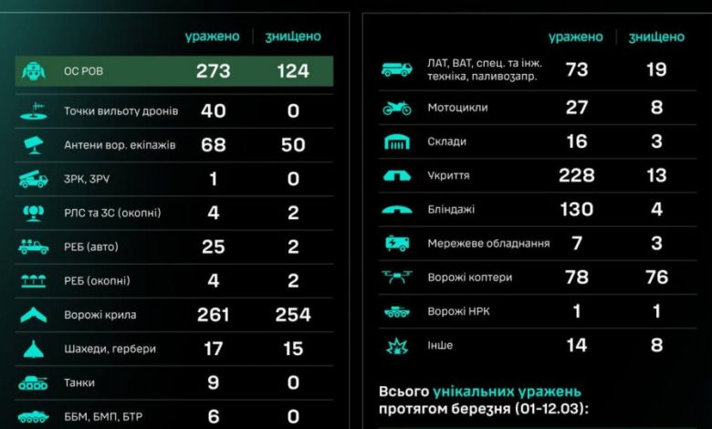 Загалом упродовж березня (01–12.03) знищено/уражено 15 369 цілей, з них 3801 — особовий склад противника.