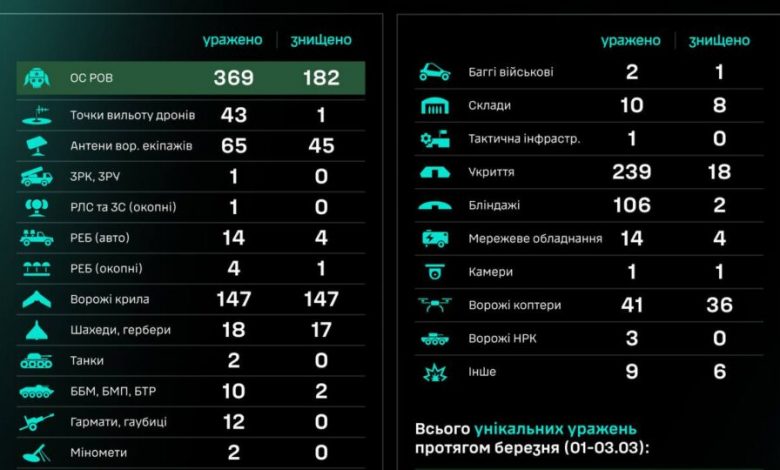 Загалом упродовж березня (01–03.03) знищено/уражено 3841 ціль, з них 963 — особовий склад противника.