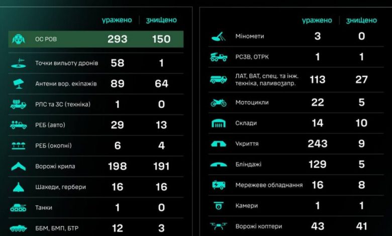 - 293 одиниці особового складу, з яких 150 — ліквідовано;
