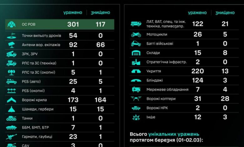 Загалом упродовж березня (01–02.03) знищено/уражено 2614 цілей, з них 594 — особовий склад противника.