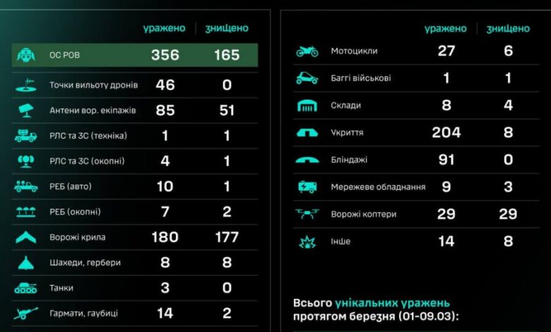 Загалом упродовж березня (01–09.03) знищено/уражено 11419 цілей, з них 2909 — особовий склад противника.