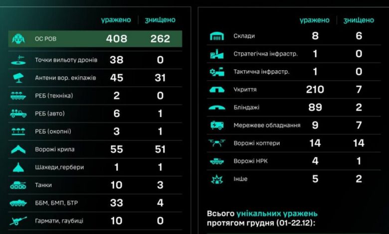 Загалом упродовж грудня (01–22.12) знищено/уражено 22 109 цілей, з них 8709 — особовий склад противника.