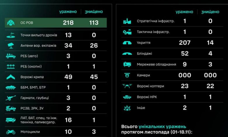 Загалом упродовж листопада (01–18.11) знищено/уражено 14 892 цілі, з них 5159 — особовий склад противника.
