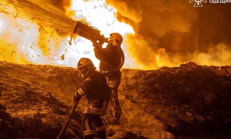 Вогнеборці Одещини ліквідовують наслідки ворожого удару. Фото: ДСНС Одещини.