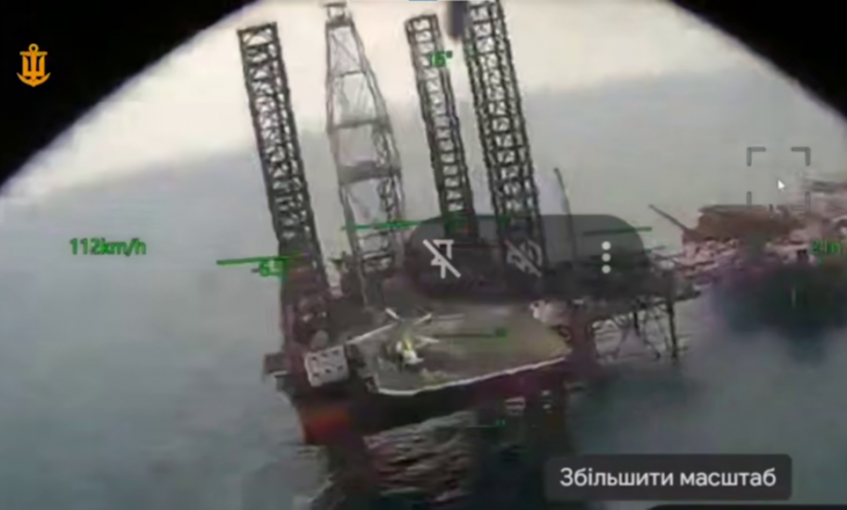 На кадрах видно, що спочатку по платформі вдарили морські дрони. Після цього ворогу, який знаходився на платформі, терміново знадобився гелікоптер, який невдовзі прилетів.