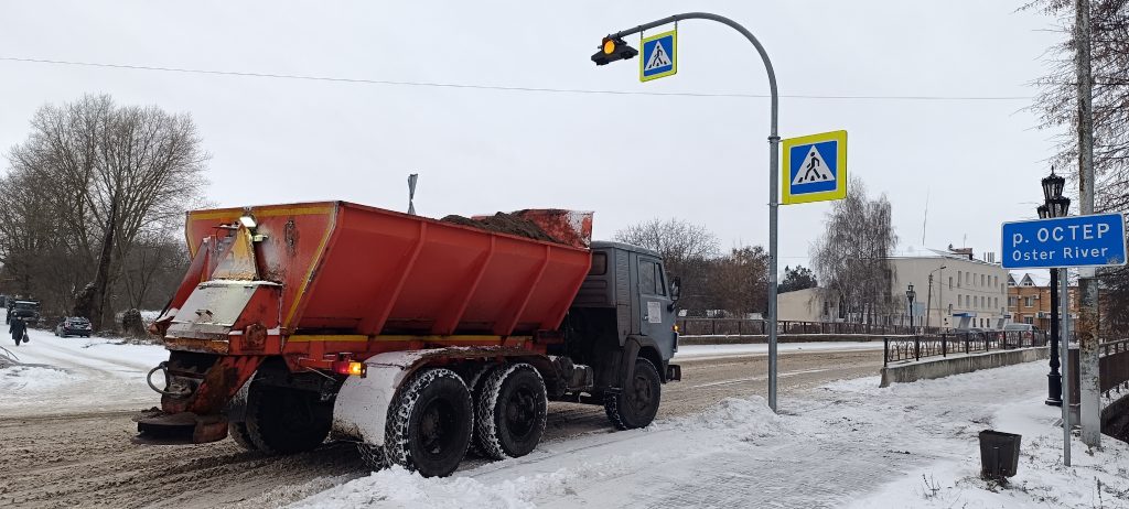 Паралельно, піскорозкидач обробляє проїжджу частину протиожеледним реагентом.